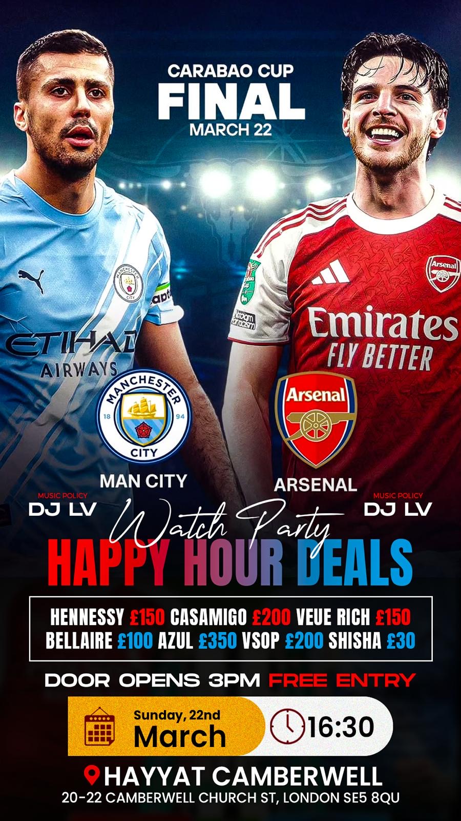 π₯ CARABAO CUP FINAL WATCH PARTY π₯ Manchester City vs Arsenal Get ready for an electric atmosphere as we bring you the Carabao Cup Final LIVE on the big screens at Hayyatt Camberwell! Whether youβre...